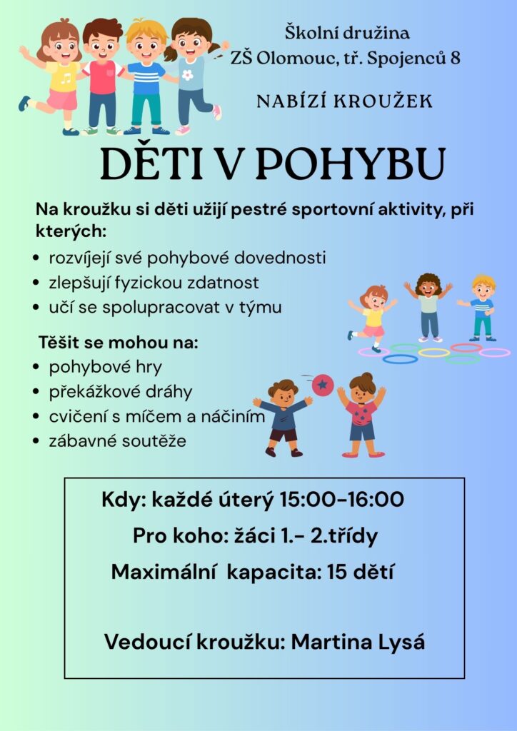 Na začátku roku vám nabízíme kroužky v rámci školní družiny. Kroužky budou zahájeny v týdnu od 13. října.