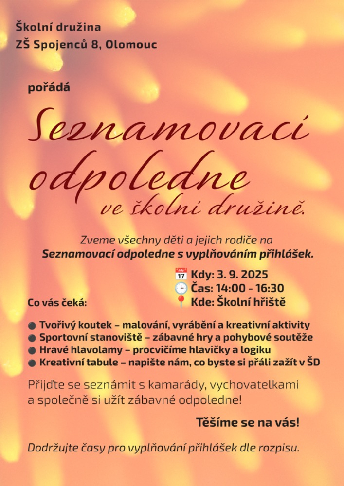 společně s paní vychovatelkou Adrianou Dospivovou vás zveme do naší školní družiny, kde nás čeká plno dobrodružství, her, tvoření, smíchu a nových kamarádství. 🌈✨